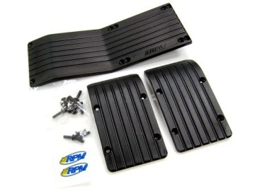 Unlike the stock center skid plate, our new molded center skid plate extends over the predominance of the chassis rails with better than 4mm of bulletproof RPM protection! The molded curves of our skid plate perfectly mate with the chassis support rails and act as a reduced-friction transition surface that prevents objects from hooking the stock rear skid plate. Other great features include: deep recessed screw holes help eliminate damage to the mounting screw heads, a matched grooved finish from the front of the truck to the rear and provide outstanding wear and impact resistance. The center skid plate provides a more solid tie between the two chassis side rails for added support and rigidity. Additionally, since our center skid plate runs the rearward length of the chassis side rails, less dirt and debris will be forced into the rear skid plate area of the chassis, improving driveline durability and drive shaft bearing longevity.RPM 3 Piece Skid Plate Set For Traxxas T/E-MAXX Specfications: